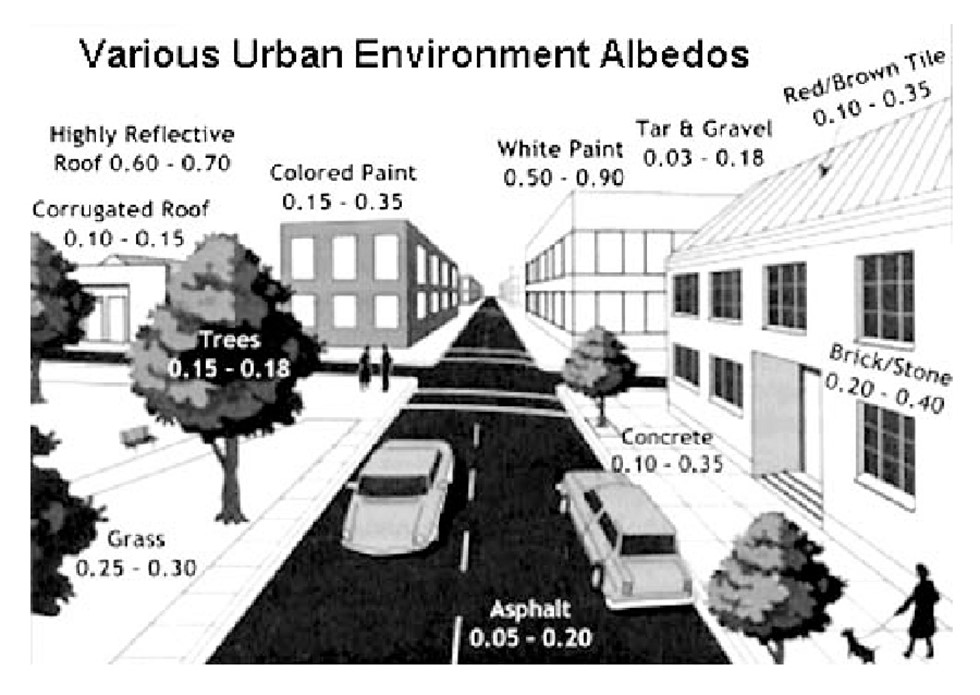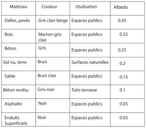 L’albédo, représentant l’indice de réfléchissement d’une surface (réflectivité + émissivité), joue un rôle majeur dans la formation des îlots de chaleur urbains. En raison de la densité, de la minéralité, et de la configuration du bâti, les zones urbaines absorbent considérablement plus d’énergie solaire que les zones environnantes. Selon les estimations de l’ADEME, plus de 40 % de la superficie d’une ville est constitué de surfaces foncées, très fréquemment de l’asphalte ou du béton. Ces revêtements ont un albédo très faible ce qui signifie qu’ils réfléchissent peu les rayons du soleil et emmagasinent de la chaleur qui est restituée durant la nuit.