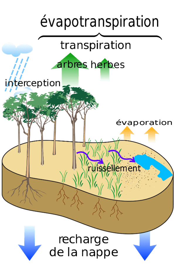 Grâce au phénomène d’évapotranspiration. Ce dernier est un processus biophysique qui implique le transfert de l’eau présente à la surface de la terre vers l’atmosphère. L’évaporation de l’eau du sol et la transpiration des plantes engendrent une réaction endothermique, contribuant ainsi au rafraîchissement de l’air.
