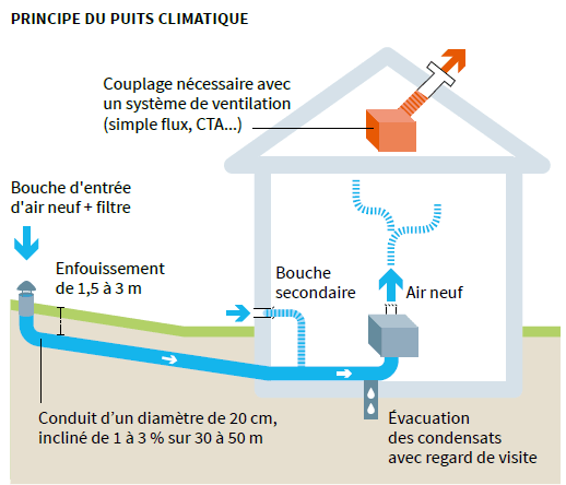 En été, l’air ambiant, qui a une température plus élevée que celle du sol, est attiré dans un conduit intégré au sol par le biais d’une bouche d’entrée. Cette dernière est couplée à un filtre pour éliminer les impuretés de l’air et d’une grille pour empêcher des intrusions et protéger le tube du conduit. L’air suit ensuite un trajet dans un conduit enterré (entre 1,5 et 3 m de profondeur) qui mesure entre 15 et 30 m et incliné afin d’évacuer les condensats et éviter la moisissure. Durant son trajet, l’air cède des calories au sol et arrive plus frais au système de ventilation de la maison. En hiver, c’est le schéma inverse, la température de la terre est plus élevée que celle de l’air ambiant. Dans sa course l’air neuf va capter des calories de la terre et arriver plus chaud au système de ventilation.